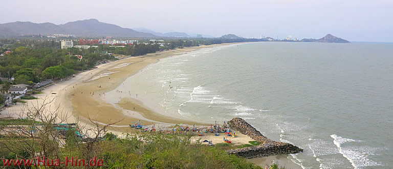 8.13 von 10 Sternen ![]() Etwa zehn Kilometer südlich von Hua Hin erstreckt sich der Strand “Khao Tao Sai Noi”, am Fuße des Hügels mit dem großen Gold Buddha „Khao Tao“, der ihm seinen Namen gegeben hat. Sie erkennen diesen Strand an seiner großen Buddha-Statue, die auf das Meer hinaus blickt. ![]() Wenn Sie einmal total abschalten möchten, sind Sie hier richtig. Der Strand ist nicht groß, aber völlig abgeschieden, somit also wesentlicher ruhiger als Hua Hin Beach. ![]() Eingeschlossen zwischen zwei massiven Felsen liegt der traumhafte Badestrand relativ einsam. ![]() Der Strand von Khao Tao ist grade einmal gute 200 Meter lang und ungefähr 30 Meter breit. Das Wasser ist allerdings leider etwas tückisch. Nach ungefähr 10 Metern fällt der Meeresboden stark ab und es können stärkere Strömungen auftreten. Lassen Sie Ihre Kinder bitte nie alleine im Wasser. ![]() Auf der schönen Felsformation wurden Figuren von dem berühmten thailändischen Dichter Sunthon Phu aufgestellt, der im 19. Jahrhundert die Geschichte von Phra Apai Mani geschrieben hat. ![]() Sie können hier in malerischer Kulisse ein schattiges Plätzchen unter einem Felsen suchen. ![]() Der Aufstieg zum goldenen Buddha ist relativ mühseelig und anstrengend. Die Treppe zu dem schalen Trampelpfad ist ein wenig versteckt. ![]() Hoch oben ragt der große, goldene Buddha zwischen den Bäumen heraus. ![]() Oben auf dem Plateau ist auch ein schattiger Felsen, unter dem Sie von dem Aufstieg verschnaufen können. ![]() Der Anblick von dem riesigen Buddha ist überwältigend. ![]() Von hier oben haben Sie einen schönen Blick auf einen kleinen Hafen, in dem Fischerboote vor Anker liegen. ![]() Von dem Plateau haben Sie einen wunderschönen Blick über den Strand von Suan Son beach. Hinten am Horizont ist auf der rechten Seite der Felsen von Khao Takiab. ![]() Wenn Sie von einem Bungalow am Strand träumen, sollten Sie zum Khao Tao Sai Noi Strand kommen. Hier finden Sie nicht nur ansprechende, gemütliche Ferienhäuser und Appartments, in der Sie behagliche Gemütlichkeit empfängt, sondern auch einige kleine typisch thailändische Restaurants.